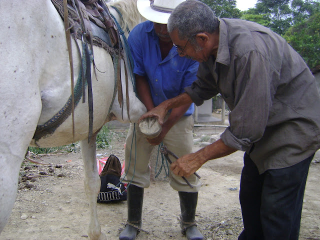 Don Juan Banegas poniendole un par dse herraduras a un caballo que fue llevado por su dueño, para lucirlo por las calles de esta comunidad.